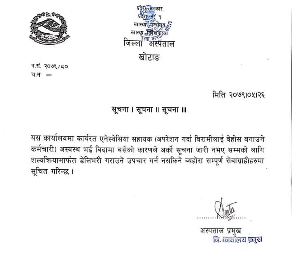 खोटाङ । जिल्ला अस्पताल खोटाङमा गर्भवतीलाई शल्यक्रियामार्फत प्रसुति गराउने सेवा अनिश्चितकालका लागि बन्द गरिएको छ । दिक्तेलस्थित जिल्ला अस्पतालमा कार्यरत एनेस्थेसिया (शल्यक्रिया गर्दा बिरामीलाई बेहोस बनाउने कर्मचारी) दुर्घटनामा खुट्टा भाँचिएर बिदामा बसेपछि गर्भवतीको शल्यक्रिया सेवा बन्द गरिएको अस्पतालले औपचारिक रुपमा सूचना प्रकाशन गरेर जानकारी दिएको हो ।