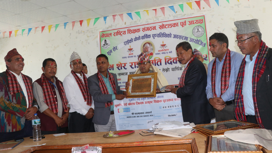 खोटाङ । ‘शुभशेर राई स्मृति प्रतिष्ठान’ खोटाङले शिक्षा क्षेत्रमा महत्वपूर्ण योगदान गर्ने दुईजना जिल्ला उत्कृष्ट शिक्षक र एकजना विद्यार्थीलाई पुरस्कार तथा छ जनालाई सम्मान गरेको छ । दिक्तेल रुपाकोट मझुवागढी नगरपालिका–१४ बुइपास्थित छिप्तीमा जन्मिएर ४३ वर्ष शिक्षण सेवा गर्नुभएका स्वर्गीय शिक्षक शुभशेर राईको सम्मान तथा सम्झनामा परिवारका १९ जना सदस्यले प्रत्येक वर्ष आफ्नो कमाइको शून्य दशमलव पाँच प्रतिशतका दरले थप गर्नेगरी चार वर्षअघि स्थापना गरेको रु ११ लाख ११ हजार १११ राशिको अक्षयकोषबाट आज (बिहीबार) पुरस्कृत तथा सम्मान गरिएको हो ।