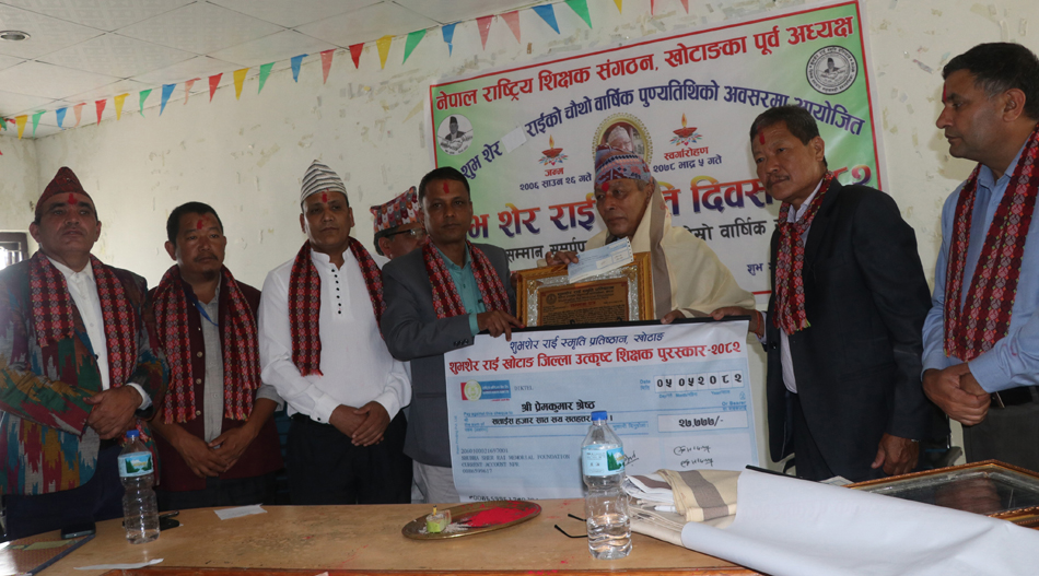 ‘शुभशेर राई स्मृति प्रतिष्ठान’ खोटाङले हरेक वर्ष प्रदान गर्दै आएको ‘शुभशेर राई जिल्ला उत्कष्ट शिक्षक पुरस्कार–२०८२’बाट पञ्चकन्या माध्यमिक विद्यालय विजयखर्क मालाका पूर्वप्रधानाध्यापक प्रेमकुमार श्रेष्ठ र पञ्च माध्यमिक विद्यालय दिक्तेलका शिक्षक पदमप्रसाद आचार्य पुरस्कृत हुनुभएको छ । प्रतिष्ठानले स्व. शिक्षक राईको चौथो वार्षिक पुण्यतिथिको अवसर पारेर दिक्तेलमा आयोजना गरेको कार्यक्रममा पुरस्कृत श्रेष्ठ र आचार्यलाई जनही नगद रु २७ हजार ७७७ राशिको पुरस्कार प्रदान गरिएको हो ।
