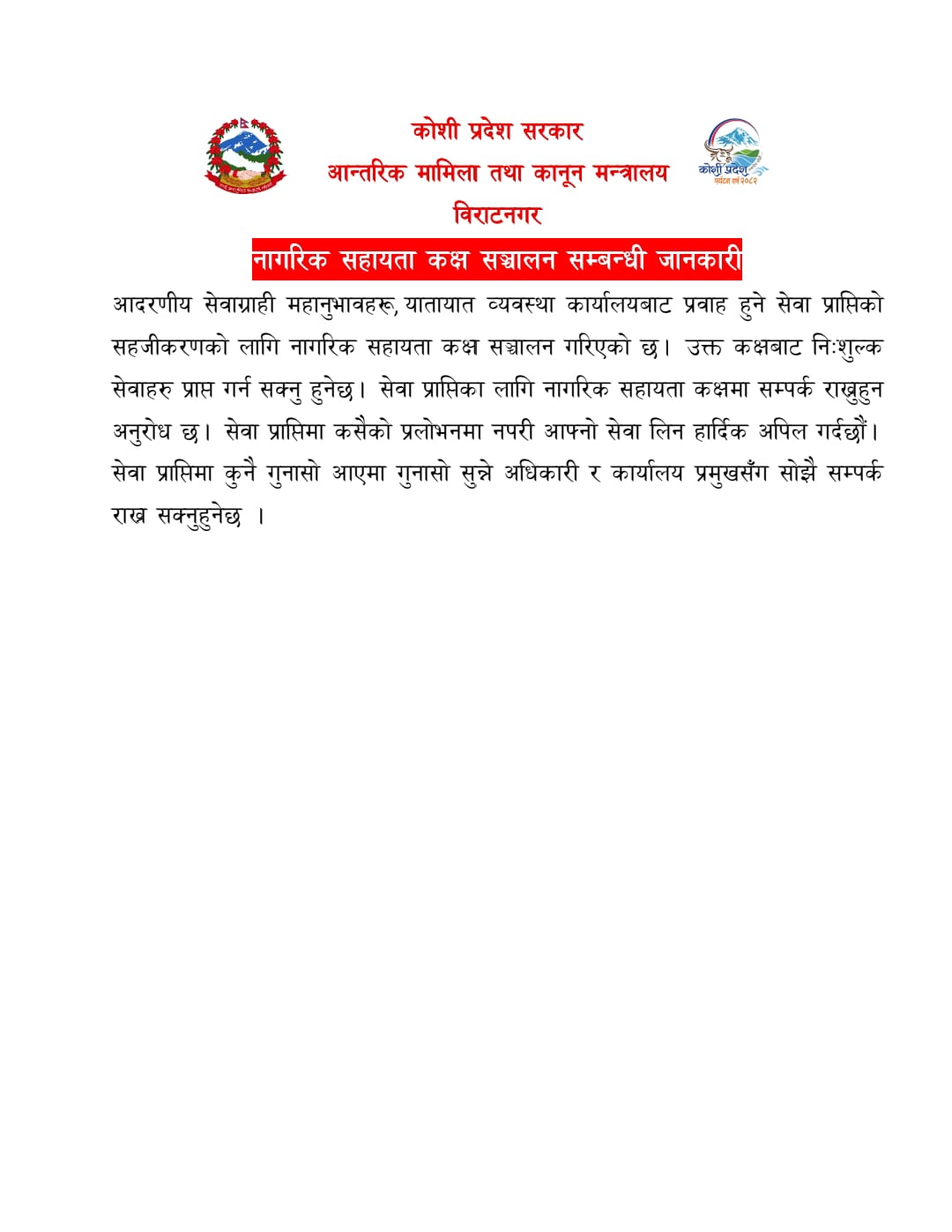 आन्तरिक तथा कानुन मन्त्रालय कोशी प्रदेशद्धारा जनहितमा जारी सन्देश मुलक सूचना